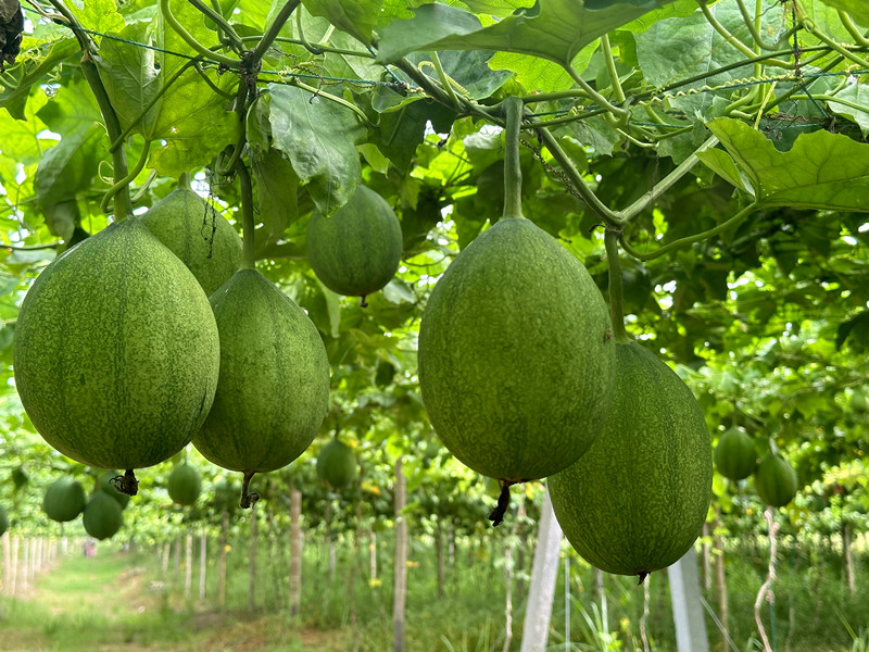8月28日,笔者来到信阳市浉河区柳林乡柳林村瓜蒌种植基地,走进基地放眼望去,一排排整齐的棚架上,瓜蒌藤蔓相互缠绕,一个个青色的瓜蒌长势喜人,沉甸甸地悬挂在蔓条上,散发出勃勃生机。