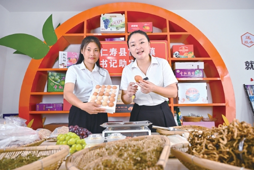 富家镇大山村党总支书记杨奕(右)正在直播销售大山村的农产品。郭侨 摄