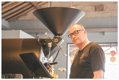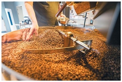 弗兰克在弥漫着咖啡醇香的工坊里,熟练地操作着烘豆机。