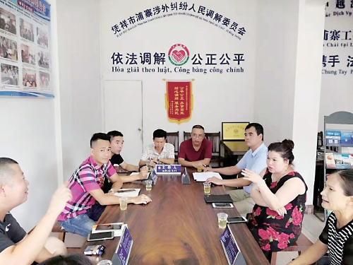 为了解决边境小额贸易口头协议较多引发矛盾纠纷难以有效化解的问题,2015年,在广西壮族自治区司法厅的指导下,浦寨社区创新成立浦寨涉外纠纷人民调解委员会,以多元调解为原则组建“国门调解员+法律专家+翻译人员”调解队伍,除了本土的6名调解员以外,还创新性地吸纳了2名中越贸易文明商户、3名越南籍“文明使者”以及18名越南籍“法律明白人”。在“以商调商、以外调外”中越客商主调的基础上,引入律师、法官、司法行政部门工作人员等专业人士。此外,还配备107名客商网格员,定期排查边贸纠纷,将矛盾纠纷化解在萌芽状态。