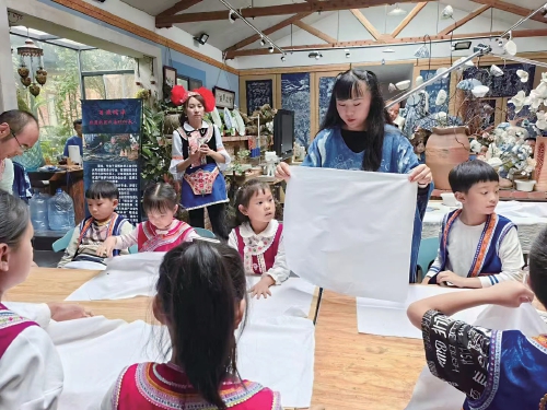 孩子们在昆明市西山区团结街道乐居村体验扎染研学课程。受访者供图