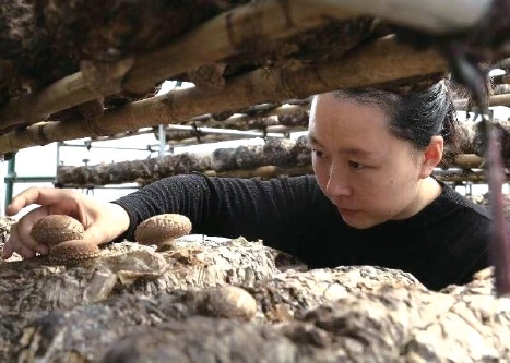 图为张丫在香菇种植大棚内查看香菇生长情况。赵茹 摄