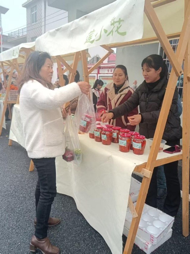 不远处的珊田村山货展位前,珊田村的江大嫂面前,一罐罐香辣霉豆腐摞成了“小山”。竹签戳起一块送入口中,游客连连哈气竖拇指:“够辣!够香!”江大嫂边补货边乐:“以前做霉豆腐只自家吃,今年乡里帮我共享‘瑶坊土特产’品牌。这辣味也销到了萍乡、南昌等地,年前这两月就卖了500多罐!咱这‘热辣山乡’,辣是味道,热是劲头!”