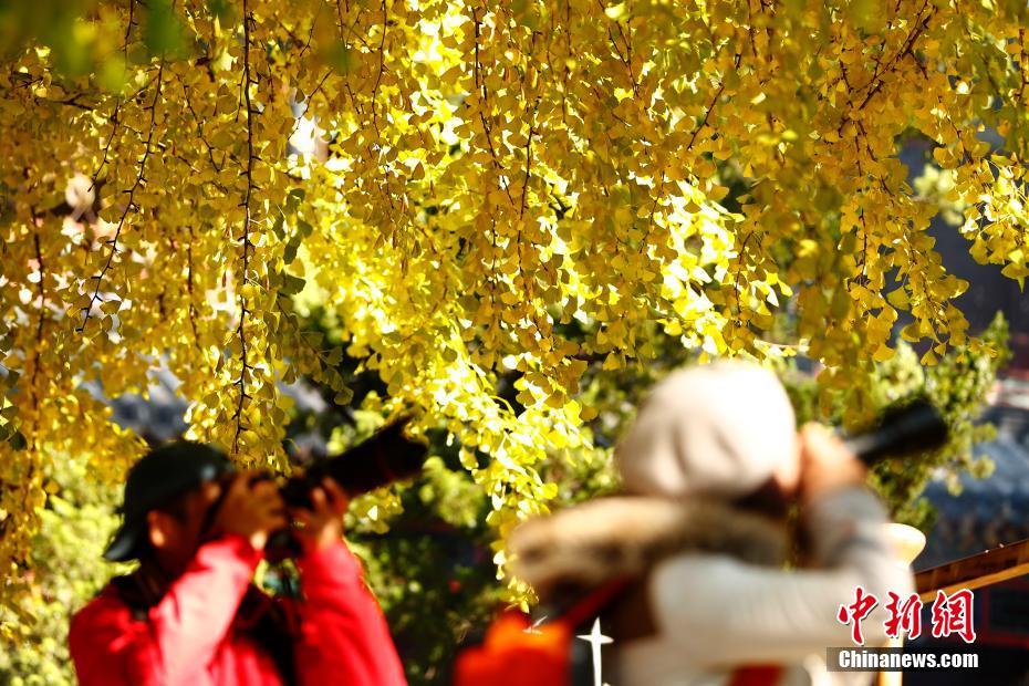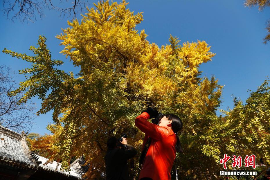 10月30日,北京民众在潭柘寺观赏千年银杏树。近日,“帝王银杏观赏季”在北京京西千年皇家古刹潭柘寺举行,寺内两株距今千余年历史的银杏树尽带“黄金甲”。